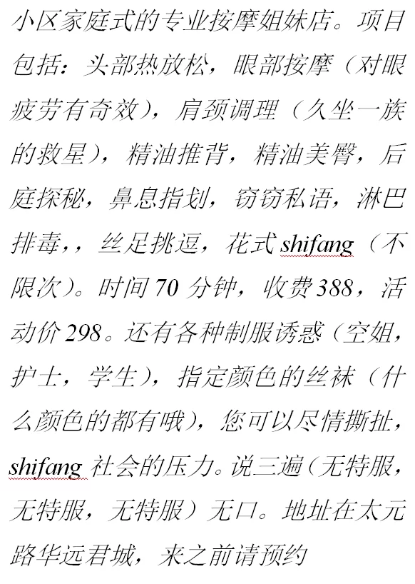 信息分类:楼凤兼职 地区:陕西省-西安 信息来源:QQ群里 小姐数量:3 小姐年龄:25 小姐素质:8 小姐外形:和照片差别不大 服务项目:丝足 释放 无特服 营业时间:联系好 都可以 环境设备:自己租得房子 还可以 安全评估:安全 详细地址:本段信息已隐藏,请先登陆。点击登陆 , 或者 点击注册 联系方式(手机号/QQ/微信):本段信息已隐藏,请先登陆。点击登陆 , 或者 点击注册 综合评价:满意得 详细介绍: 不会写黄文 总之可以的 无特服 就是诱惑加释放 楼凤兼职