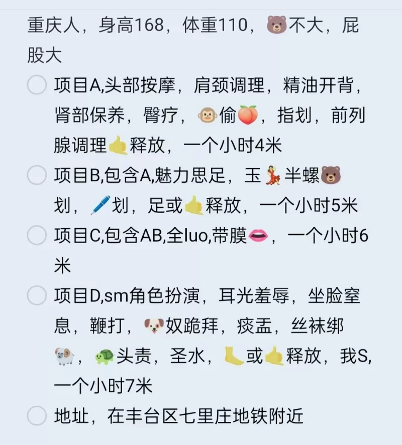 具体自己联系,妹子挺靠谱的,不催人,项目不错,小活或者SM(只做女王),有兴趣的兄弟们可以去看看。具体的看图片。