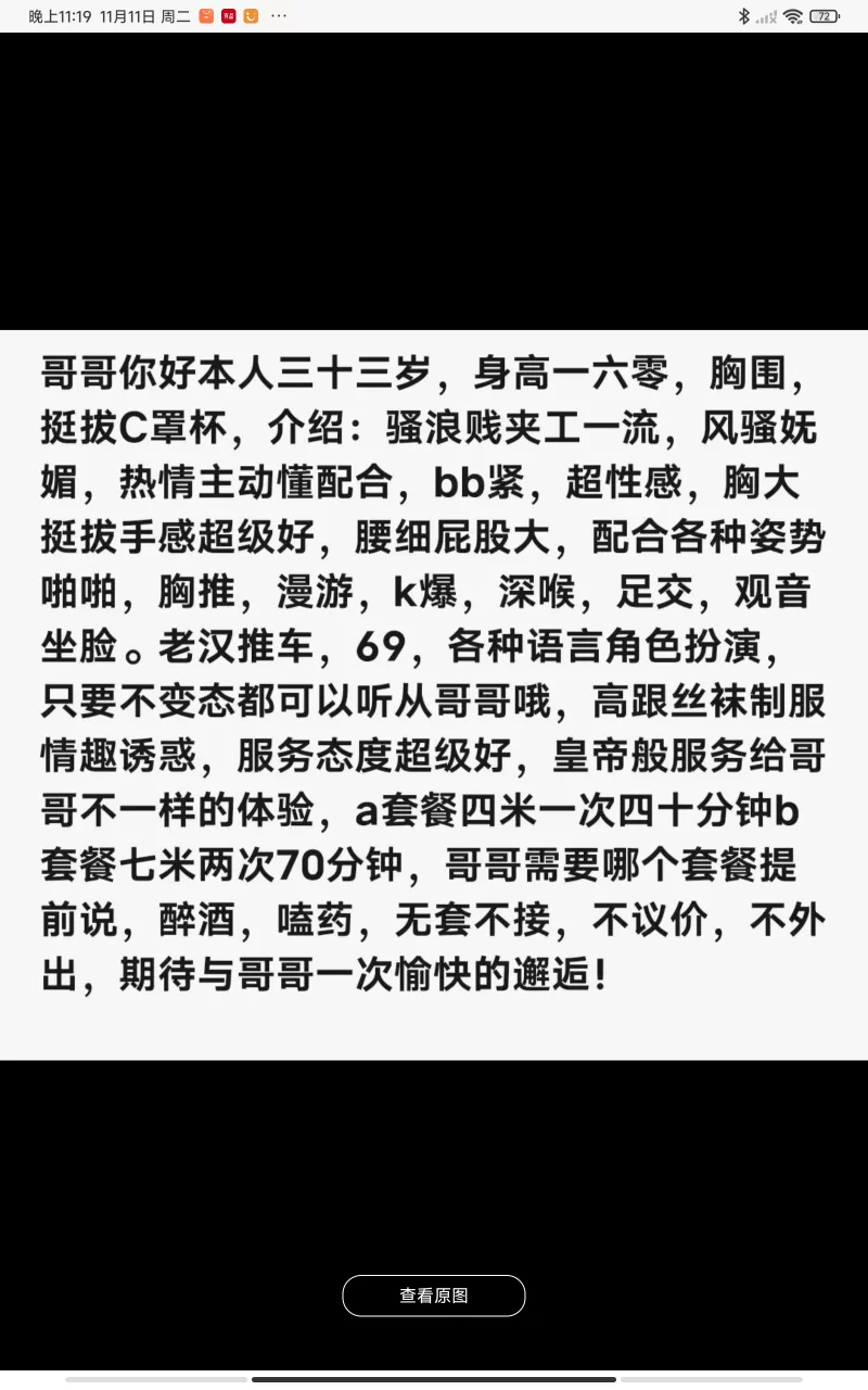 威客管理提示:要求付定金 保证金的,总之提前要钱的都是骗子 提前一天联系的,下午就去了,到了只会直接就开始了,别说,还不错。遗憾的是房间烟味挺大,过了一会儿才缓过来,人比较年轻,和图片有差距,胖一些,自己去体会吧